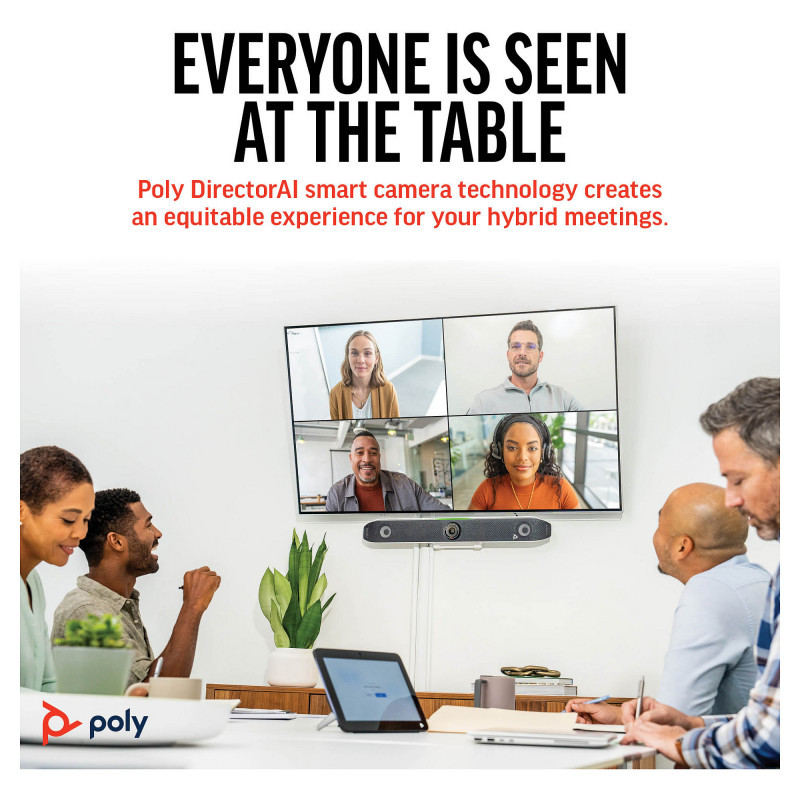 Ensure everyone is represented equally on the call with quality audio and video paired with innovative technologies by Poly that include pinpoint-accurate AI-enhanced automatic framing and smart audio filtering.