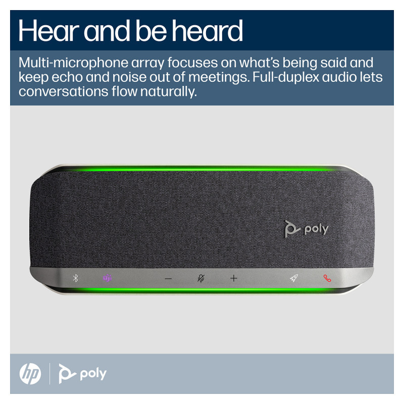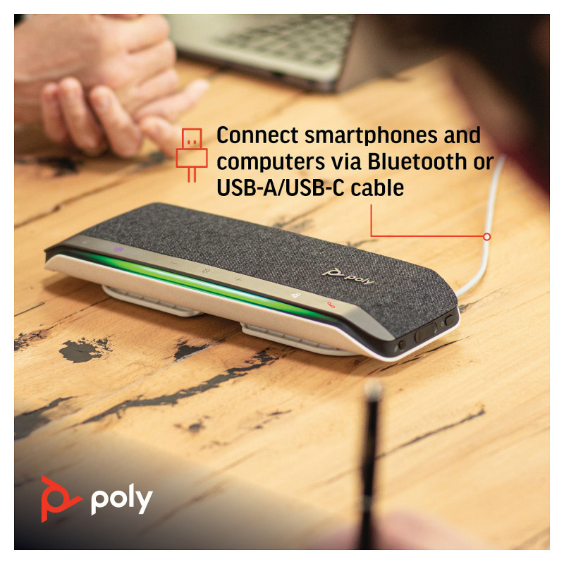 "HP Poly Sync 40 Microsoft Teams Certified Speakerphone. Device type: PC, Product colour: Silver, Cable length: 1.05 m. Microphone frequency: 100 - 7800 Hz. Connectivity technology: Wireless, Bluetooth profiles: A2DP, AVRCP, HFP, HSP, USB connector type: USB Type-A, USB Type-C. Power source type: Battery, Battery technology: Lithium-Ion (Li-Ion), Talk time: 30 h. Compliance certificates: RoHS, Federal Communications Commission (FCC), CE"\n"Flexible. Simple. Smart