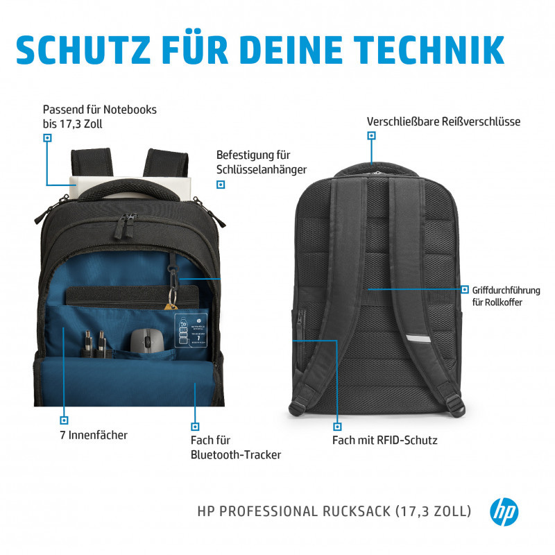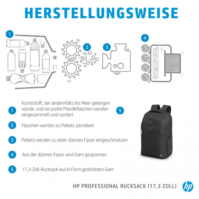 "HP Professional 17.3-inch Backpack. Case type: Backpack, Maximum screen size: 43.9 cm (17.3""). Weight: 740 g. Surface coloration: Monochromatic"\n"Designed With You and the Environment In Mind