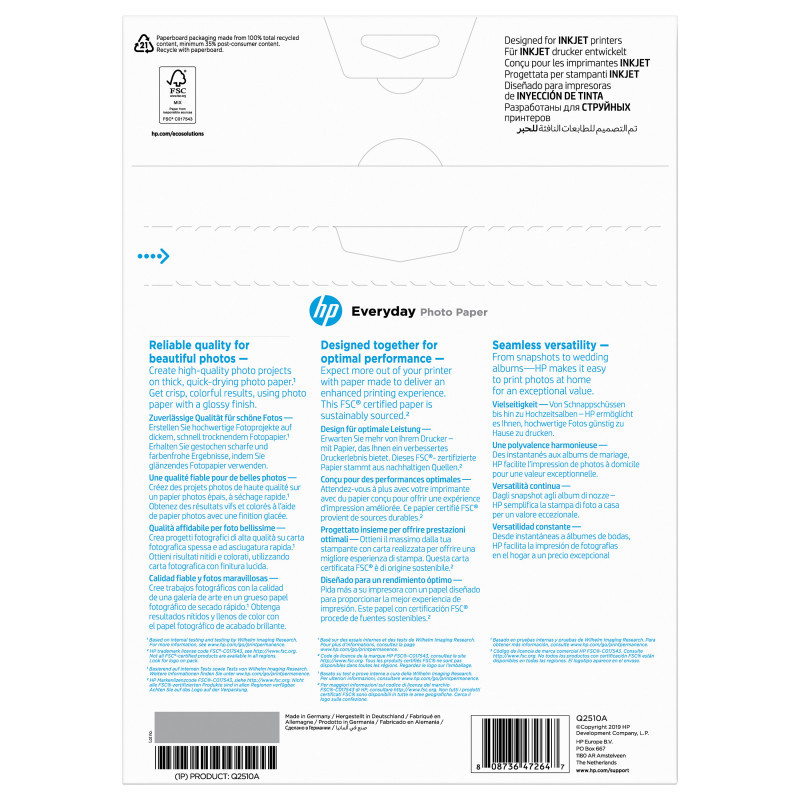 Hold nothing back. With affordable, at home photo printing, you can cover every wall and share every memory on this FSC-certified[3] paper. Your fade-resistant[2] prints have a glossy finish for brilliant photos."