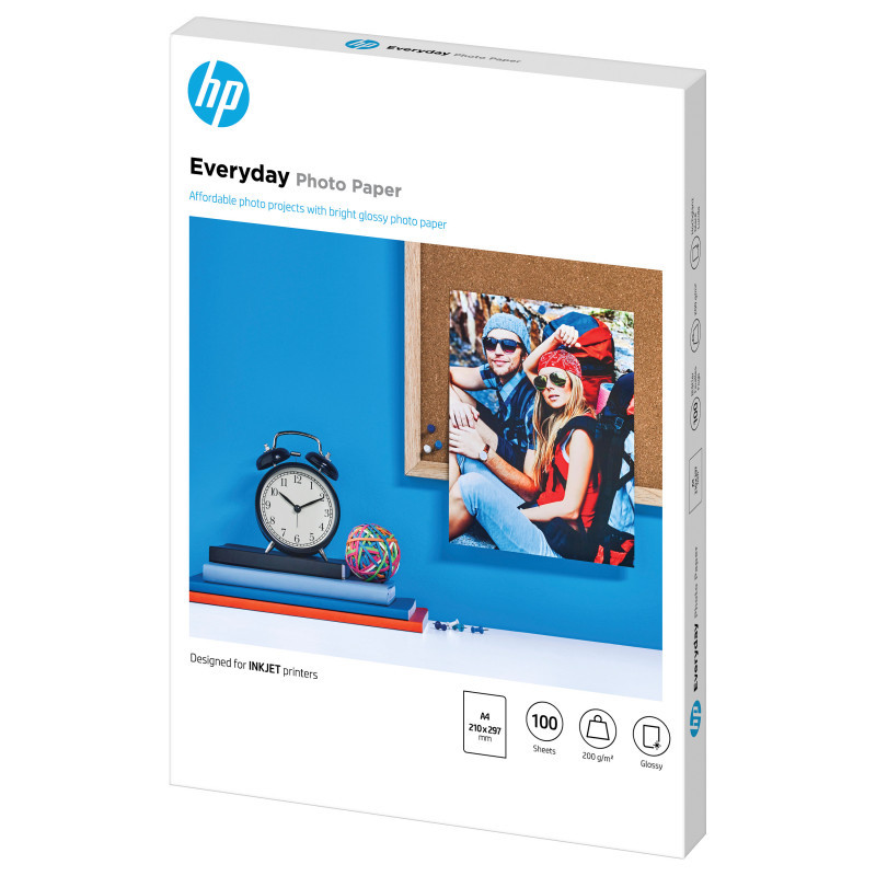 "HP Everyday Photo Paper Glossy 200 g/m2 A4 (210 x 297 mm) 100 sheets. Compatible products: Works with inkjet printers, optimized for Original HP Ink. Width: 211.6 mm, Depth: 16.3 mm, Height: 300 mm. Quantity per pack: 1 pc(s), Package width: 300 mm, Package depth: 211.6 mm. Pallet gross weight: 377 kg, Master (outer) cases per pallet: 30 pc(s), Products per pallet: 300 pc(s). Country of origin: Germany"\n"Ideal for inkjet printer users and HP Inkjet printer owners who want affordable casual photo printing at home.