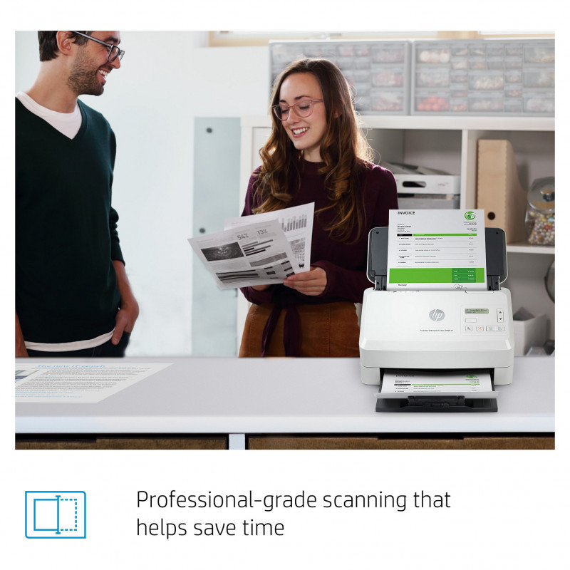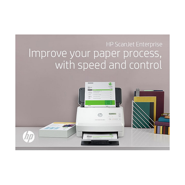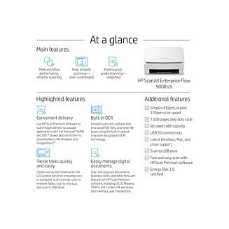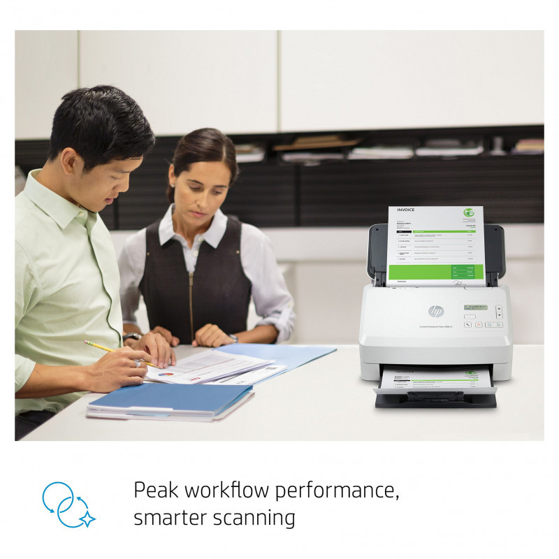 "HP Scanjet Enterprise Flow 5000 s5. Maximum scan size: 216 x 3100 mm, Optical scanning resolution: 600 x 600 DPI. Scanner type: Sheet-fed scanner, Product colour: White. Sensor type: CMOS CIS, Daily duty cycle (max): 7500 pages, Scanning noise level: 65 dB. Auto document feeder (ADF) input capacity: 80 sheets. Maximum ISO A-series paper size: A4"\n"Give your office high-volume scanning performance. Recommended for 7,500 pages per day.