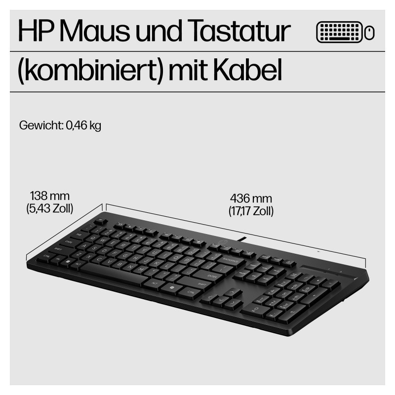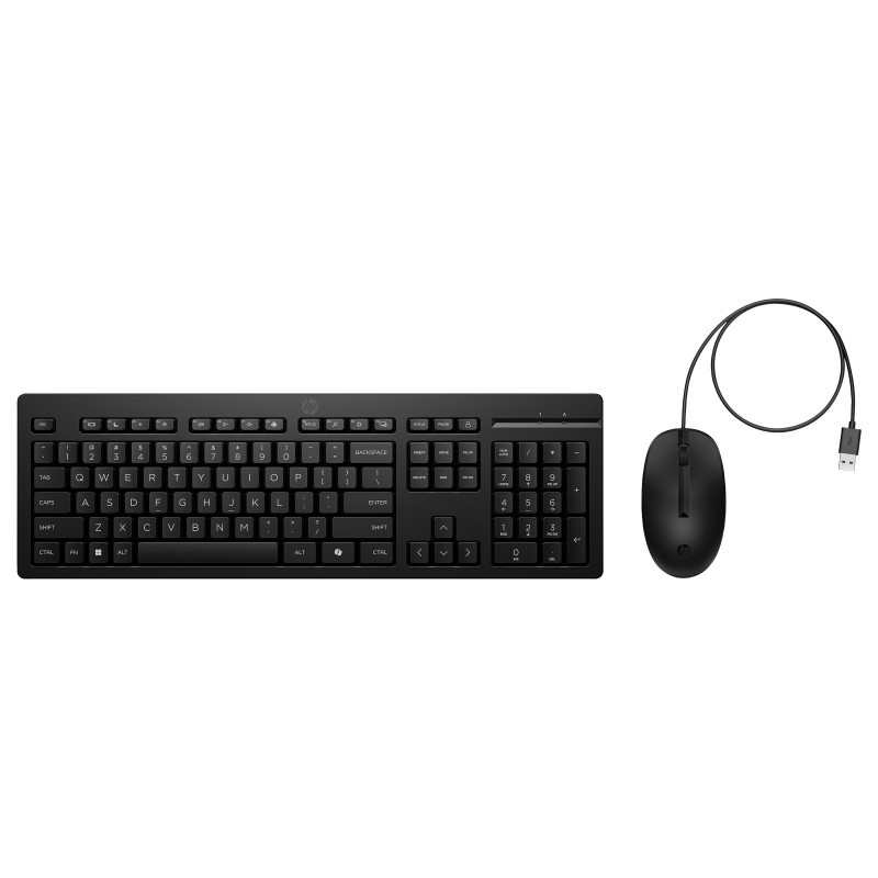 "HP 225 Wired Mouse and Keyboard Combo. Keyboard form factor: Full-size (100%), Connectivity technology: Wired, Device interface: USB. Cable length: 1.8 m. Recommended usage: Office. Product colour: Black. Mouse included"\n"Every Day Productivity