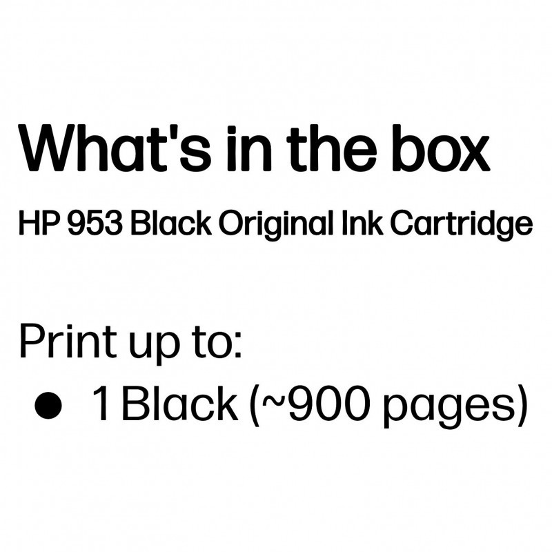 "HP 953 Black Original Ink Cartridge. Cartridge capacity: Standard Yield, Black ink type: Pigment-based ink, Black ink volume: 20 ml, Supply type: Single pack, Printing colours: Black, Quantity per pack: 1 pc(s), Black ink page yield: 900 pages"\n"Ideal for large workgroups who need dependable performance for affordable, professional-quality printing, page after page.