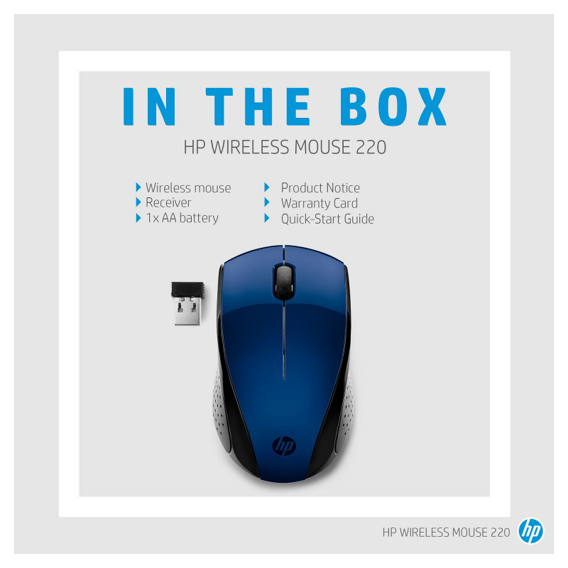 "HP Wireless Mouse 220 (Lumiere Blue). Form factor: Ambidextrous. Device interface: RF Wireless, Buttons type: Pressed buttons, Buttons quantity: 3, Scroll type: Wheel. Power source: Batteries. Product colour: Blue"\n"An ambidextrous travel-sized wireless mouse with long battery life