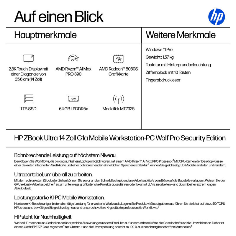 HP ZBook Ultra 14 G1a AMD Ryzen AI Max PRO 390 35.56cm 14Zoll 2.8k 64GB 1TB/SSD W11P 1J Gar (EU)
