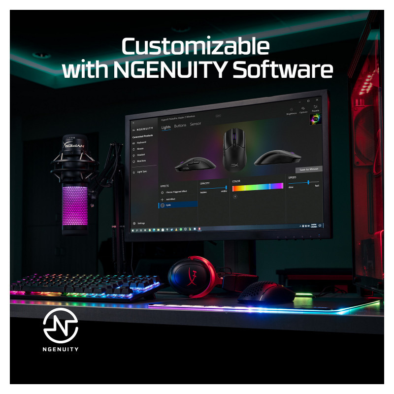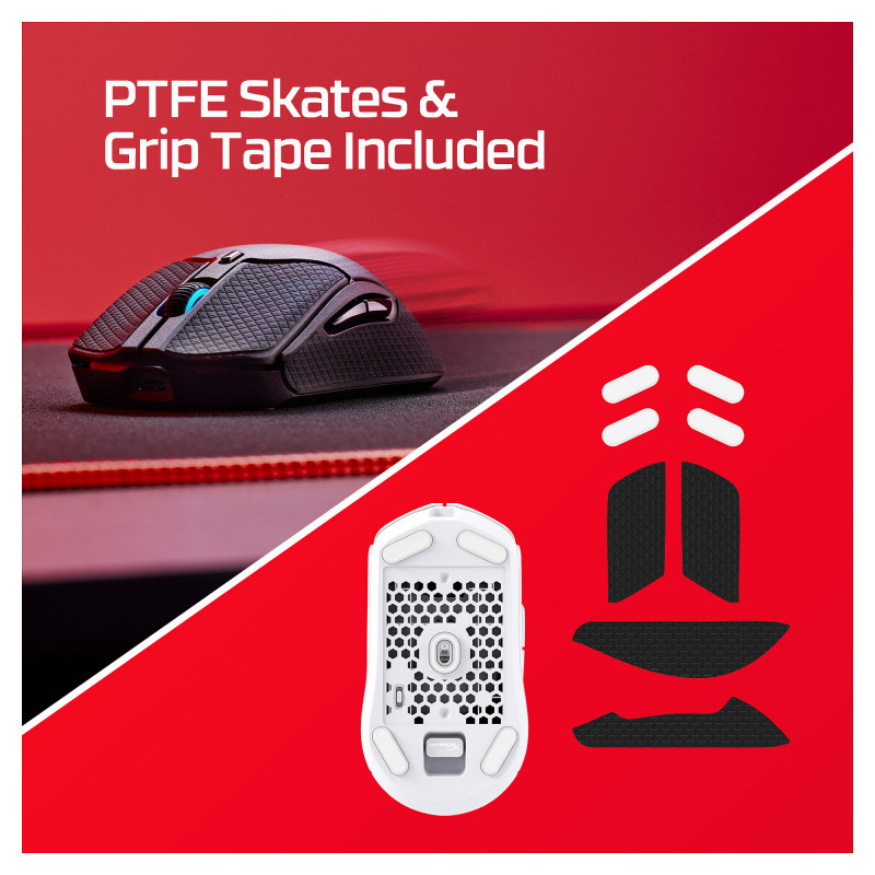 The HyperX Pulsefire Haste 2 Wireless is built for gamers who can’t afford to waste a millisecond and want the freedom of wireless connectivity. This sequel had a solid upper shell and keeps the 61g[3] weight and 100-hour[2] battery life of the original Pulsefire Haste, but builds upon it with several refinements. Pulsefire Haste 2 Wireless has dual mode wireless connectivity, allowing you to switch between 2.4GHz wireless and Bluetooth connections, and a charging cable so you can charge while using the mouse in wired mode. We’ve also built out a full suite of high-performance HyperX custom components, highlighted by the precision HyperX 26K Sensor with a native DPI of up to 26,000 and a tracking speed of up to 650 IPS. Our custom HyperX Switches provide tactile, audible feedback on each satisfying click, and are rated for a lifespan of up to 100 million clicks. You’ll also enjoy superior physical control of your mouse with smooth, low-friction skates, and the included grip tape. Get the most out of every mouse movement with HyperX NGENUITY Software and create macros for the 6 programmable buttons, customize your DPI settings, and personalize the RGB lighting."