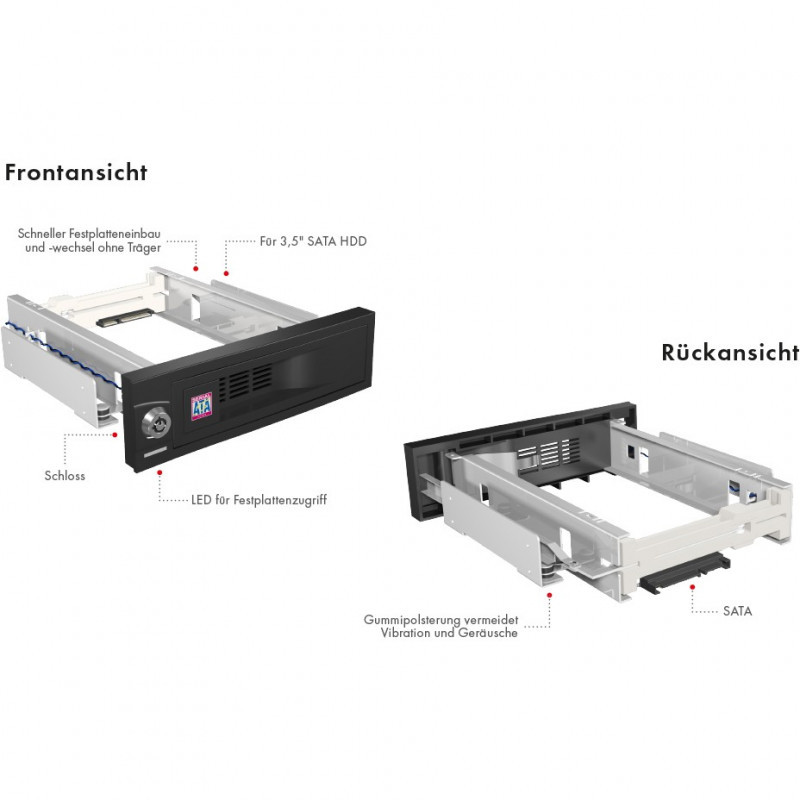 The SATA III connector (compatible with SATA I/II/II) is a so-called NSS connector (non-scratch-SATA). Up to 50000 HDD exchanges can take place without causing any issue.A lock makes sure than no unauthorized person will have access to the media."