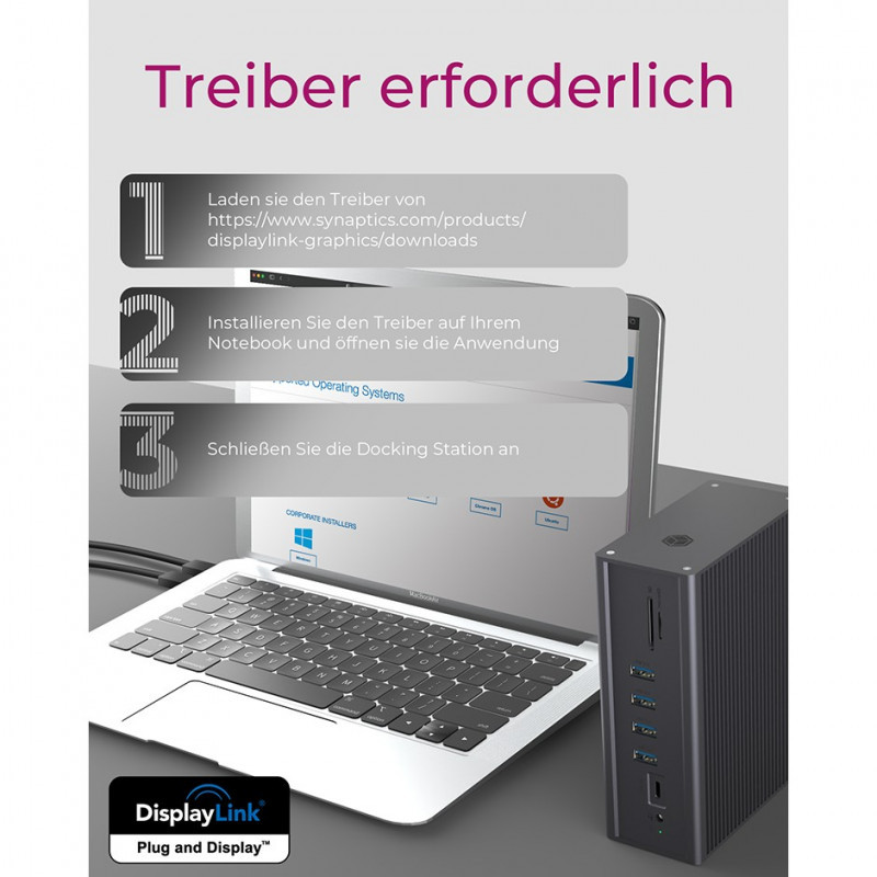 The IB-DK2262AC provides up to three video interfaces of different resolutions with two HDMI® and one VGA connection, enabling the simultaneous connection of HDMI® and VGA display devices in expansion mode. This is achieved by combining state-of-the-art technologies such as DisplayLink® and DisplayPort™ Alt Mode.