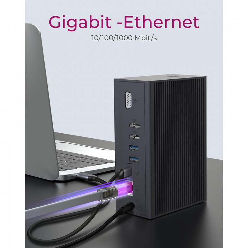 "ICY BOX IB-DK2262AC. Connectivity technology: Wired, Host interface: USB 3.2 Gen 1 (3.1 Gen 1) Type-C, USB Power Delivery up to: 55 W. Ethernet LAN data rates: 10,100,1000 Mbit/s. Product colour: Anthracite, Compatible memory cards: MicroSD (TransFlash), SD, HD type: 4K Ultra HD. Power source type: AC, AC input voltage: 100-240 V, AC input frequency: 50 - 60 Hz. Windows operating systems supported: Windows 10, Windows 11, Windows 8, Other operating systems supported: ChromeOS"\n"Rugged aluminium design