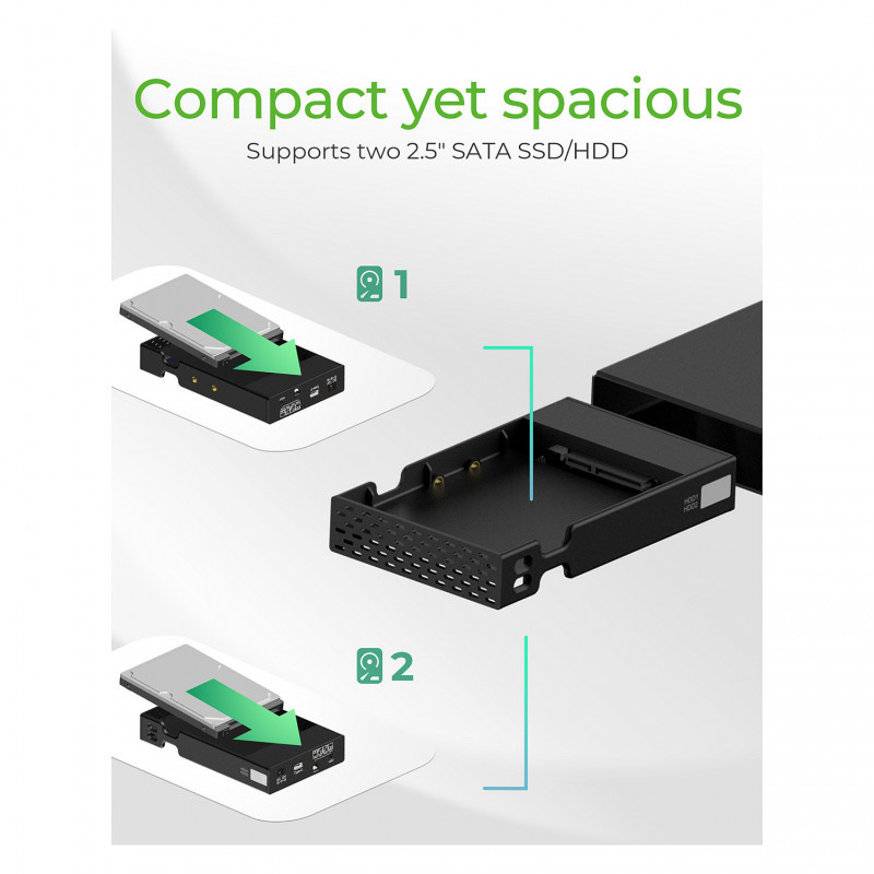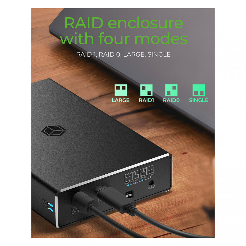 "ICY BOX RAID enclosure for 2x HDD/SSD USB 3.2 Gen 2 Type-C® / Type-A interface. Product type: HDD/SSD enclosure. Number of storage drives supported: 1, Storage drive size: 2.5"", Supported storage drive interfaces: Serial ATA, Serial ATA II, Serial ATA III. Data transfer rate: 10 Gbit/s. RAID levels: 0, 1. Product colour: Black. USB connector type: USB Type-C"\n"Failure safety or performance