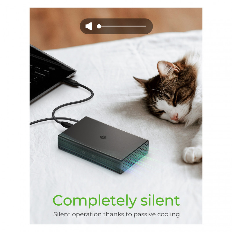 The enclosure is made from aluminium and therefore very durable. Designed with passive cooling and without a fan, both professional and private workplaces benefit from this very silent setup. A status LED keeps you informed about the current state of the installed drives at all times."