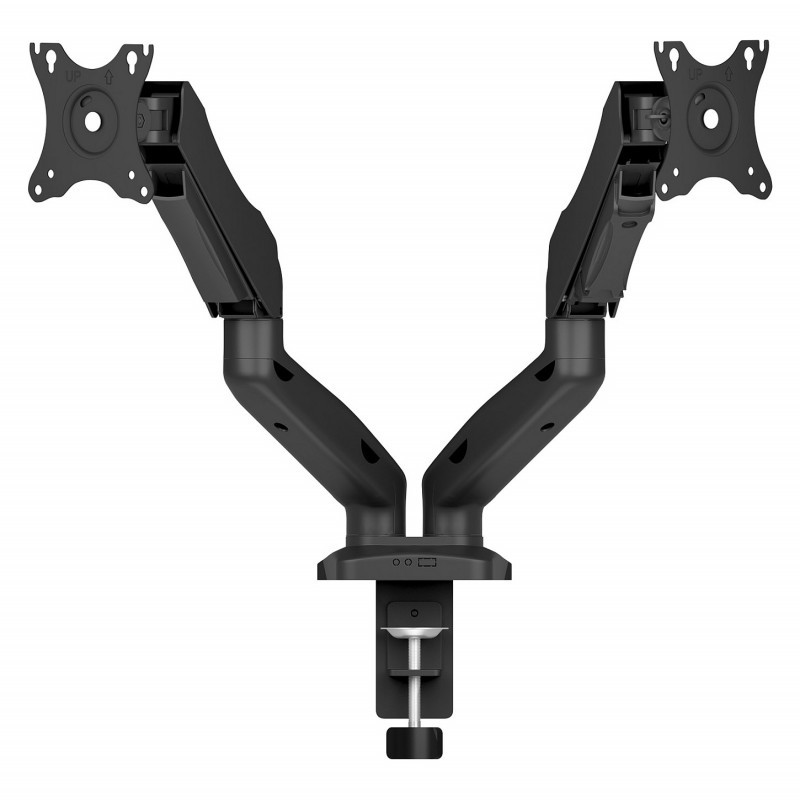 "ICY BOX IB-MS204-T. Mounting: Clamp/Grommet, Maximum weight capacity: 18 kg, Maximum screen size: 81.3 cm (32""), Minimum VESA mount: 75 x 75 mm, Maximum VESA mount: 100 x 100 mm. Height adjustment, Swivel angle range: -180 - 180°, Tilt angle range: -45 - 45°. Product colour: Grey, Silver"\n"Dual monitor desk mount