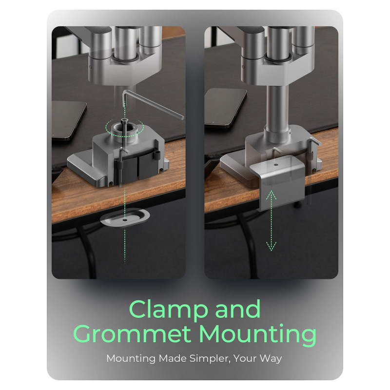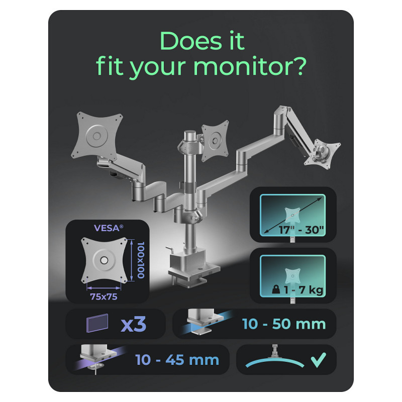 "ICY BOX IB-MS525-T. Mounting: Clamp/Grommet, Maximum weight capacity: 21 kg, Maximum screen size: 76.2 cm (30""), Minimum VESA mount: 75 x 75 mm, Maximum VESA mount: 100 x 100 mm. Height adjustment, Swivel angle range: -90 - 90°, Tilt angle range: -45 - 90°. Product colour: Grey, Silver"\n