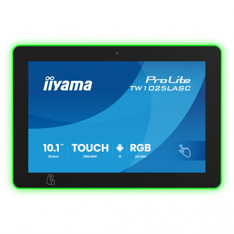 "iiyama ProLite TW1025LASC-B3PNR. Display diagonal: 25.6 cm (10.1""), Display resolution: 1280 x 800 pixels, HD type: WXGA, Display technology: LED, Response time: 25 ms, Native aspect ratio: 16:10, Viewing angle, horizontal: 160°, Viewing angle, vertical: 160°. Built-in speaker(s). Built-in USB hub. VESA mounting. Product colour: Black"\n"The ProLite TW1025LASC-B3PNR touch panel PC is a perfect choice for high-use environments such as booking rooms, information desks or other corporate and hospitality applications. The Optical Bonded Projective Capacitive (PCAP) 10-point touch technology ensures a seamless and accurate touch response and a lower light reflection, in addition, the display is protected against humidity and potential moisture development. Thanks to the pre-installed Android 13 operating system, it is possible to easily customize the monitor by installing applications directly to it. The Power over Ethernet technology (POE) allows to provide both data connection and power by a single cable, simplifying all installations. Thanks to the NFC/RFID reader, the touch panel PC allows to communicate wirelessly with enabled devices or tags within close proximity and the RGB Led bar will clearly and intuitively indicate the availability status of the room. Additionally, it integrates effortlessly with iiSignage² , iiyama’s Content Management System (CMS), giving you full control over your messages and advertising, in landscape portrait and face-up position. Together with the built-in 5 megapixel camera, microphone and speakers it offers limitless, interactive installation possibilities."