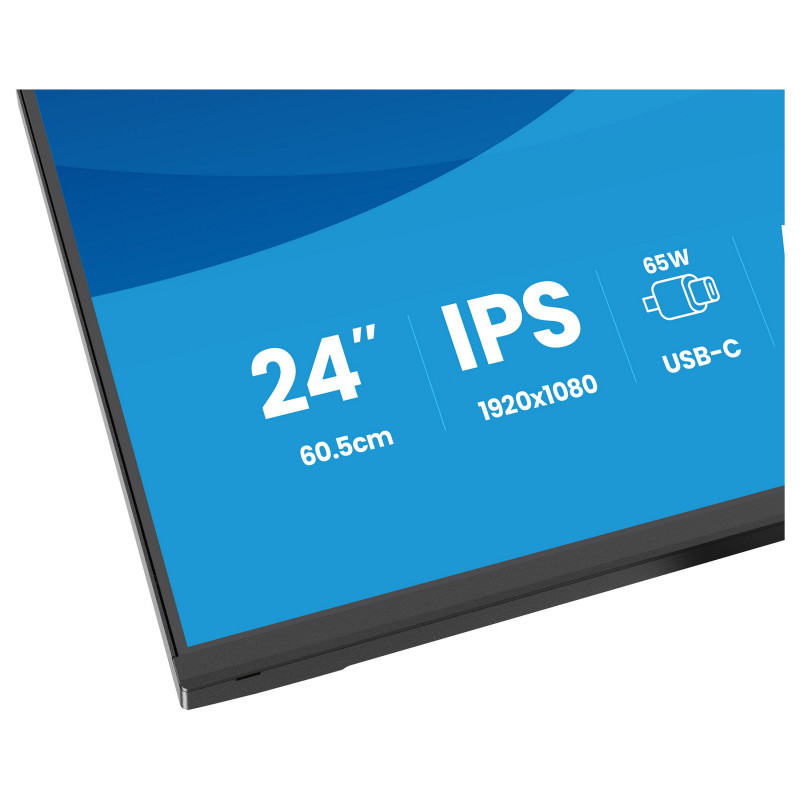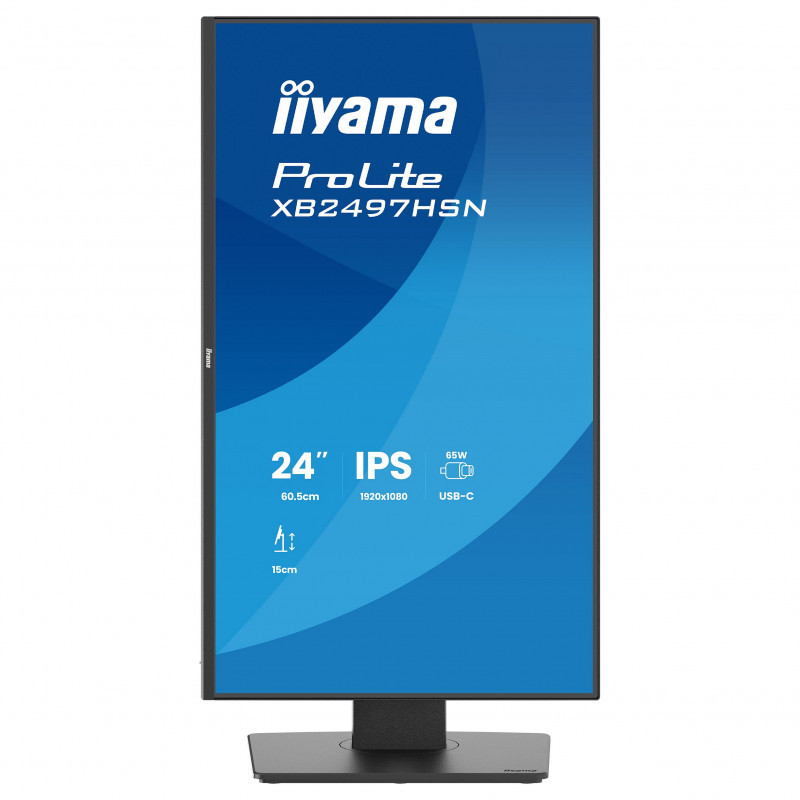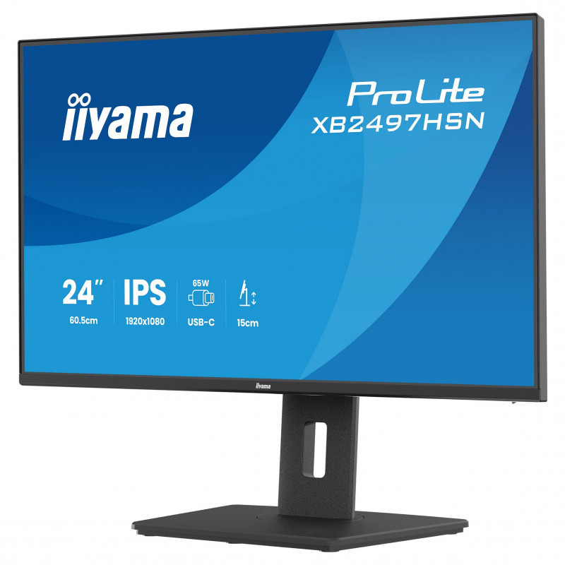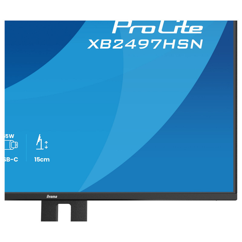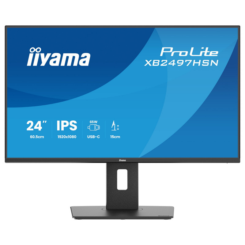 "iiyama ProLite XB2497HSN-B1. Display diagonal: 60.5 cm (23.8""), Display resolution: 1920 x 1080 pixels, HD type: Full HD, Display technology: LED, Display surface: Matt, Response time: 1 ms, Native aspect ratio: 16:9, Viewing angle, horizontal: 178°, Viewing angle, vertical: 178°. Built-in speaker(s). Built-in USB hub, USB hub version: 3.2 Gen 1 (3.1 Gen 1). VESA mounting, Height adjustment. Product colour: Black"\n"With an integrated USB-C dock, it allows you to connect your laptop, transfer video, and power or charge your device using a single cable. The DisplayPort output lets you easily connect a second monitor, making it ideal for multitasking and extended desktop setups. When the monitor is connected to the internet via LAN, your laptop also gains instant access to a wired network. Alongside USB-C, the monitor features HDMI and DisplayPort inputs to support a wide range of devices, as well as a USB hub for connecting peripherals directly. Flicker free technology helps reduce eye strain. The monitor is also certified for Eye Comfort, ensuring viewing comfort throughout the day. The ergonomic stand offers height adjustment, tilt, swivel and pivot functions, allowing you to position the screen to your needs. With a four side slim bezel design, the XB2497HSN-B1 is an excellent choice for clean, modern, and multi-monitor workspaces."