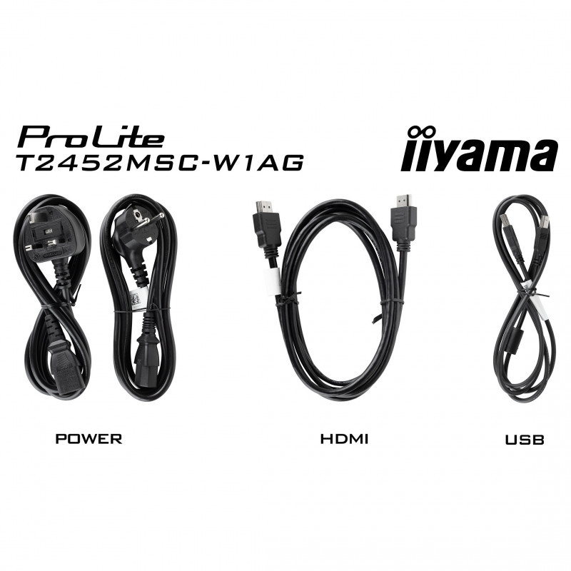 "iiyama ProLite T2452MSC-W1AG. Display diagonal: 60.5 cm (23.8""), Display resolution: 1920 x 1080 pixels, HD type: Full HD, Display technology: LED, Response time: 5 ms, Native aspect ratio: 16:9, Viewing angle, horizontal: 178°, Viewing angle, vertical: 178°. Built-in speaker(s). Built-in USB hub, USB hub version: 3.2 Gen 1 (3.1 Gen 1). VESA mounting. Product colour: White"\n"Enjoy smooth and intuitive control with the ProLite T2452MSC-W1AG, a 24"" Full HD touchscreen built for natural and precise touch. Its DeepContrast PCAP+ (Projective Capacitive) 10-point touch technology ensures instant responsiveness, vivid contrast and reduced reflections thanks to optical bonding, in addition, the display is protected from moisture and potential condensation development. The anti-fingerprint and anti-glare coating keeps the screen clean and easy to read, while the IPS panel delivers rich colours and consistent image quality from any angle. Designed for comfort and efficiency, the adjustable stand supports ergonomic positioning, and the integrated cable management system keeps your workspace neat. With built-in audio and versatile connectivity (HDMI, DisplayPort, USB 3.2 hub), it offers a clean and flexible setup. Sleek edge-to-edge glass and a refined white design make it as stylish as it is functional – perfect for interactive signage, retail, POS, hospitality and creative spaces."