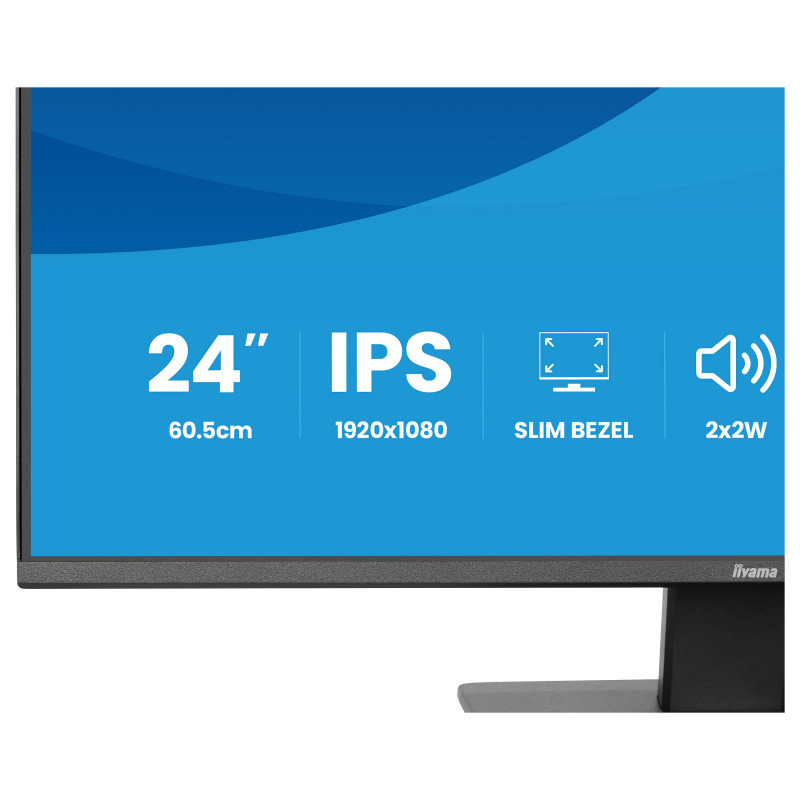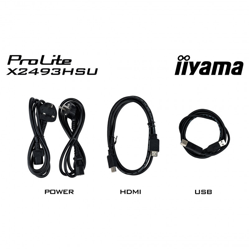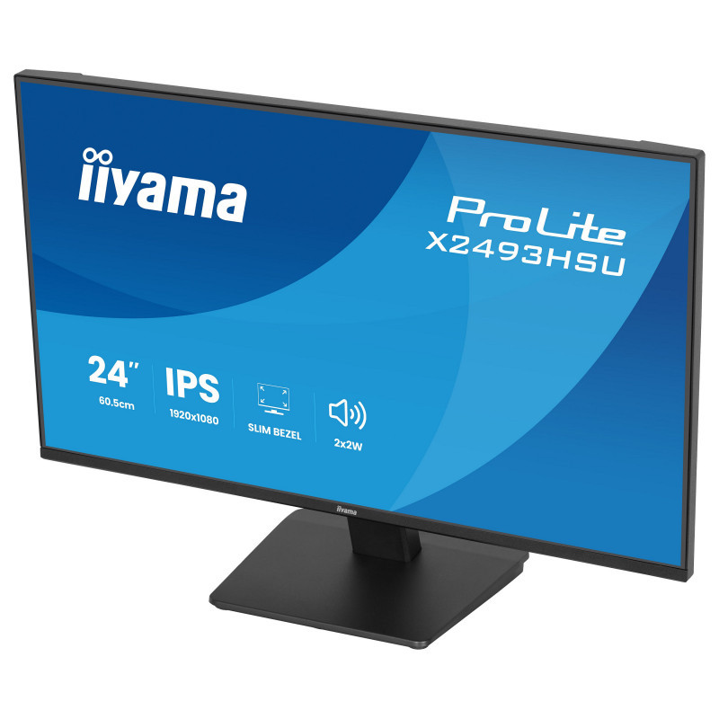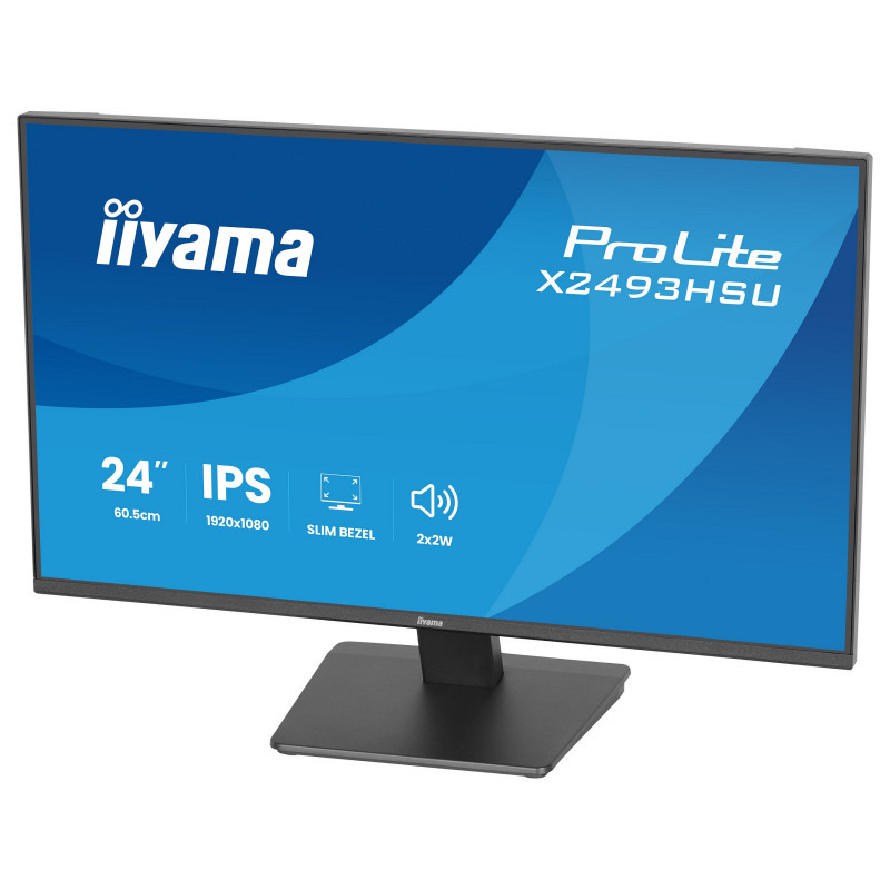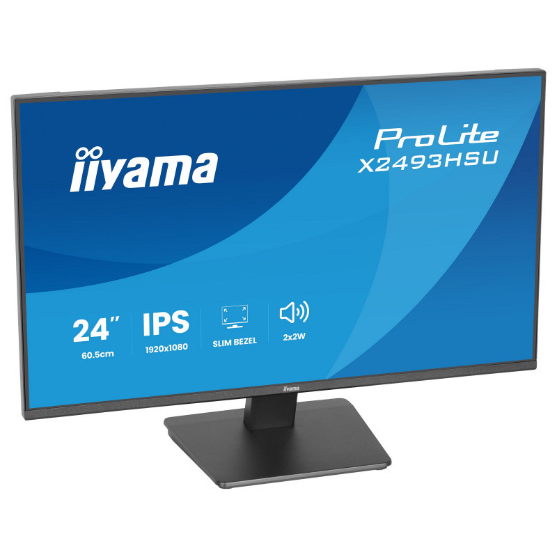 "iiyama ProLite X2493HSU-B1. Display diagonal: 60.5 cm (23.8""), Display resolution: 1920 x 1080 pixels, HD type: Full HD, Display technology: LED, Display surface: Matt, Native aspect ratio: 16:9, Viewing angle, horizontal: 178°, Viewing angle, vertical: 178°. Built-in speaker(s). Built-in USB hub, USB hub version: 2.0. VESA mounting. Product colour: Black"\n"The ProLite X2493HSU is the ideal choice if you are looking for a compact, high-performance display that integrates effortlessly into a multi-monitor workspace. Its four-side ultra-slim bezel design creates a clean, modern aesthetic and delivers seamless visuals across multiple screens. The IPS panel ensures sharp detail, accurate colour reproduction and wide viewing angles, while the 120Hz refresh rate provides a smooth and responsive user experience. Whether you are working on documents, editing content or browsing the web, flicker-free technology and a blue light reducer help reduce eye strain and improve long-term viewing comfort. For convenience and efficiency, the X2493HSU features built-in speakers, a two-port USB hub, HDMI and DisplayPort inputs, and a headphone socket. This simplifies your desk setup and provides flexible connectivity for your devices. With EPEAT registration, TCO10 Certified compliance and an Energy Label C rating, this monitor supports your sustainability objectives without compromising on performance."