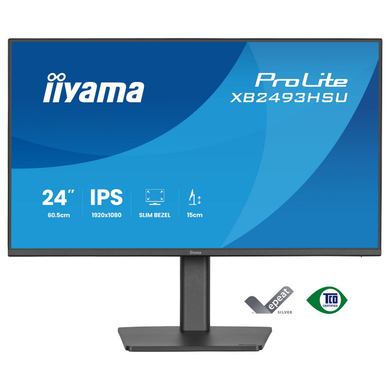 "iiyama ProLite XB2493HSU-B1. Display diagonal: 60.5 cm (23.8""), Display resolution: 1920 x 1080 pixels, HD type: Full HD, Display technology: LED, Display surface: Matt, Response time: 1 ms, Native aspect ratio: 16:9, Viewing angle, horizontal: 178°, Viewing angle, vertical: 178°. Built-in speaker(s). Built-in USB hub, USB hub version: 2.0. VESA mounting, Height adjustment. Product colour: Black"\n"The ProLite XB2493HSU is perfect if you need a compact, high-performance monitor that fits seamlessly into a multi-screen workspace. The four-side ultra-slim bezel design gives you a clean, modern desk setup and uninterrupted viewing across displays. You’ll enjoy sharp detail, vivid colours and wide viewing angles with the IPS panel, while the 120Hz refresh rate keeps everything smooth and responsive. Flicker-free technology and a blue light reducer support your eye comfort during long hours of use. The fully adjustable ergonomic stand helps you stay comfortable and focused, with 15cm height adjustment plus tilt, swivel and pivot functions, so you can easily set the screen to match your posture. Built-in speakers, a two-port USB hub, HDMI and DisplayPort inputs, and a headphone socket keep your workspace simple and connected. With EPEAT registration, TCO10 compliance and an Energy Label C rating, it’s a smart, sustainable choice that works as hard as you do."