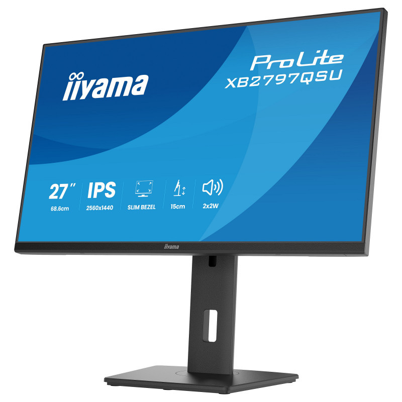 "iiyama ProLite XB2797QSU-B1. Display diagonal: 68.6 cm (27""), Display resolution: 2560 x 1440 pixels, HD type: Quad HD, Display technology: LED, Display surface: Matt, Response time: 1 ms, Native aspect ratio: 16:9, Viewing angle, horizontal: 178°, Viewing angle, vertical: 178°. Built-in speaker(s). Built-in USB hub, USB hub version: 3.2 Gen 1 (3.1 Gen 1). VESA mounting, Height adjustment. Product colour: Black"\n"The ProLite XB2797QSU is perfect if you want a compact, high-performance display that fits seamlessly into a multi-monitor setup. The four-side slim bezel creates a clean, modern workspace and ensures uninterrupted visuals across screens. With a sharp QHD 2560x1440 resolution and IPS panel technology, this 27-inch monitor delivers outstanding image clarity, consistent colour accuracy and wide viewing angles. It is ideal for professionals who multitask, work with detailed visuals or compare documents side by side. Adjust the screen to suit your posture with a fully ergonomic stand offering 15 cm height adjustment, as well as tilt, swivel and pivot functions. This helps you create a comfortable and healthy workspace tailored to your individual needs. Whether you're working on documents, editing content or browsing the web, flicker-free technology and TÜV Rheinland Eye Comfort certification ensure the display meets strict criteria for low blue light and long-term viewing safety. The XB2797QSU also comes equipped with integrated stereo speakers, a four-port USB hub, and versatile connectivity options including HDMI, DisplayPort, and a headphone socket, helping you maintain an organised and efficient workspace. Certified to EPEAT Silver and TCO10 standards, the XB2797QSU offers reliable performance and essential user-focused features for productive modern work environments."