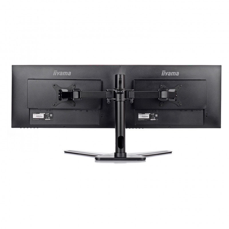 "iiyama DS1002D-B1. Maximum weight capacity: 10 kg, Minimum screen size: 25.4 cm (10""), Maximum screen size: 76.2 cm (30""), Minimum VESA mount: 75 x 75 mm, Maximum VESA mount: 100 x 100 mm. Height adjustment, Tilt angle range: -85 - 15°. Product colour: Black"\n"The iiyama DS1002D-B1 is a desk mount stand for two flat screens up to 30”. The monitor arm allows you to save space on your desk reducing the number of stands to one only and the cable management system makes it easier to keep your workplace tidy. The easy to set-up stand offers broad adjustment capabilities, including tilt, swivel, height and rotation, so you can easily adjust the position of both screens to your preferences assuring comfortable and healthy body posture."