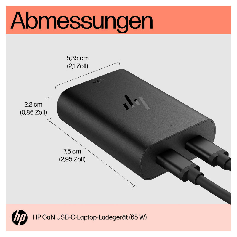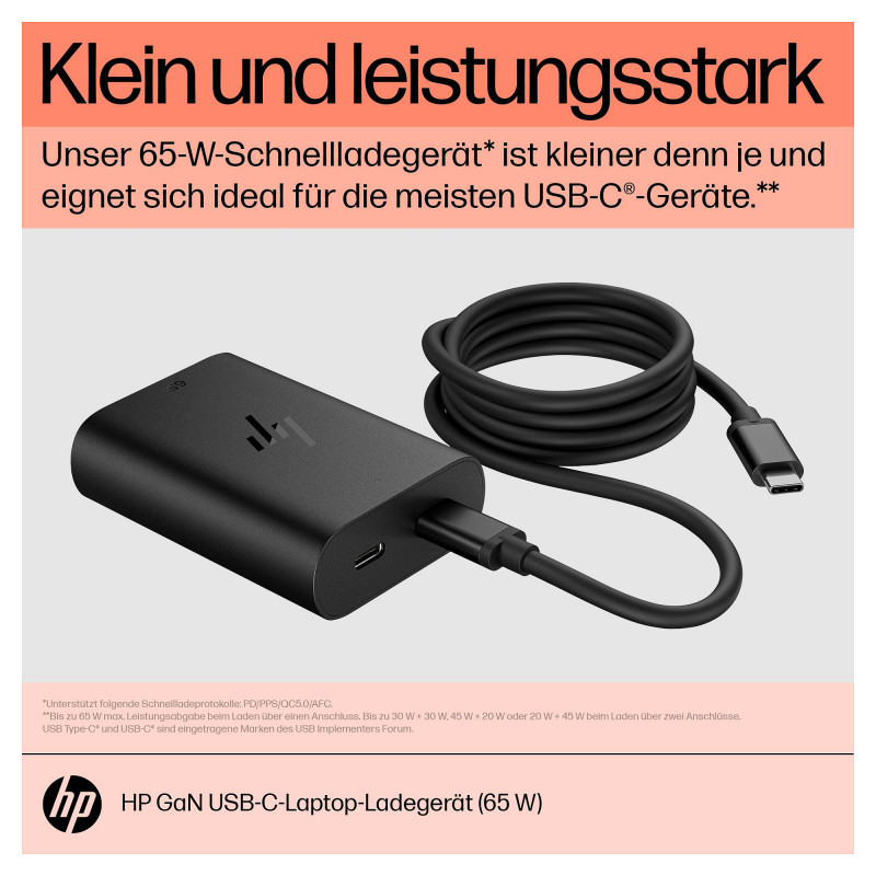 "HP 65W GaN USB-C Laptop Charger. Purpose: Laptop, Power supply type: Indoor, Output power: 65 W. USB connector type: USB Type-C. Product colour: Black. Compliance certificates: CCC, Federal Communications Commission (FCC), CE. Sustainable technologies and materials: Outside box and corrugated cushions are 100% sustainably sourced and recyclable; 30% post-consumer..."\n"Powerfully Petite