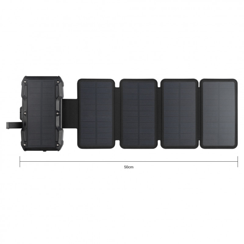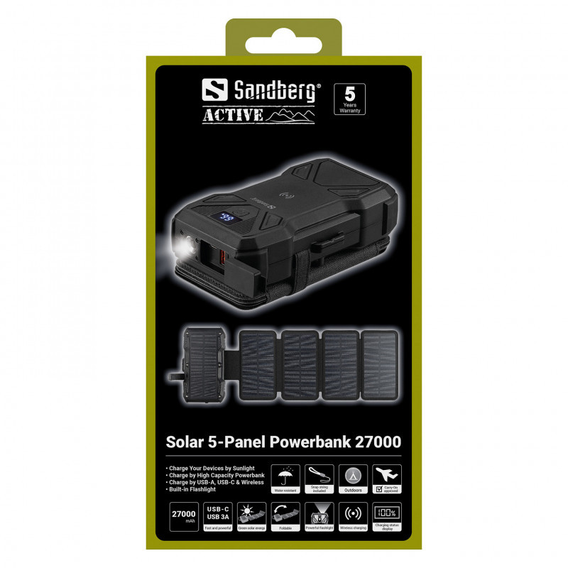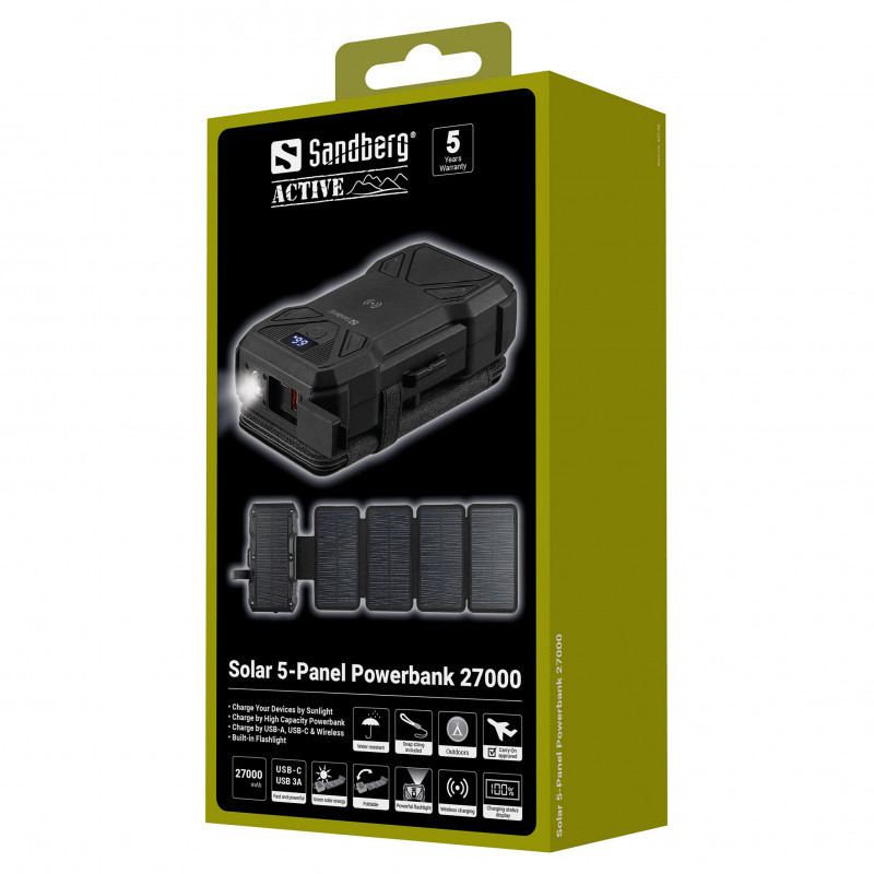 "Sandberg Solar 5-Panel Powerbank 27000. Battery capacity: 27000 mAh, Fast charging technology: Programmable Power Supply (PPS), Wireless charging. Output current: 5 A. Product colour: Black"\n"Solar 5-Panel Powerbank 27000 is a combo of a powerful 27000 mAh powerbank and a foldable solar panel, allowing you to quickly and efficiently recharge the powerbank in sunlight. Charge it at home and place it in the sun whenever you get the chance. This way, you'll always have power for your mobile devices, no matter how far you are from an outlet."