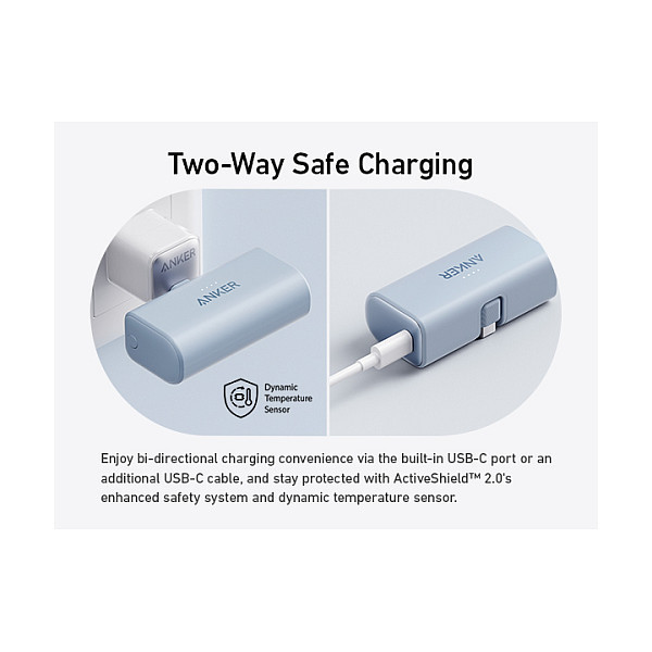 With the two-way charging feature, charge and recharge your devices using the built-in USB-C port or an additional USB-C cable, and stay protected with ActiveShield™ 2.0's enhanced safety system and the dynamic temperature sensor.