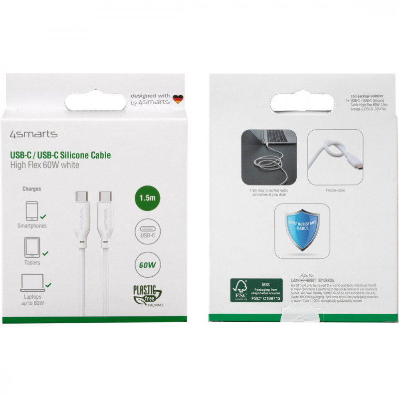 "4smarts 468761. Cable length: 1.5 m. Connector 1: USB C, Connector 2: USB C, USB version: USB 2.0, Maximum data transfer rate: 0.48 Gbit/s, Product colour: White"\n"- Feel the difference: once in your hand, you can never go back. The surface treatment with soft silicone is comfortable soft, with improved flexibility.