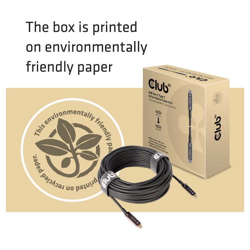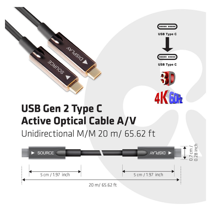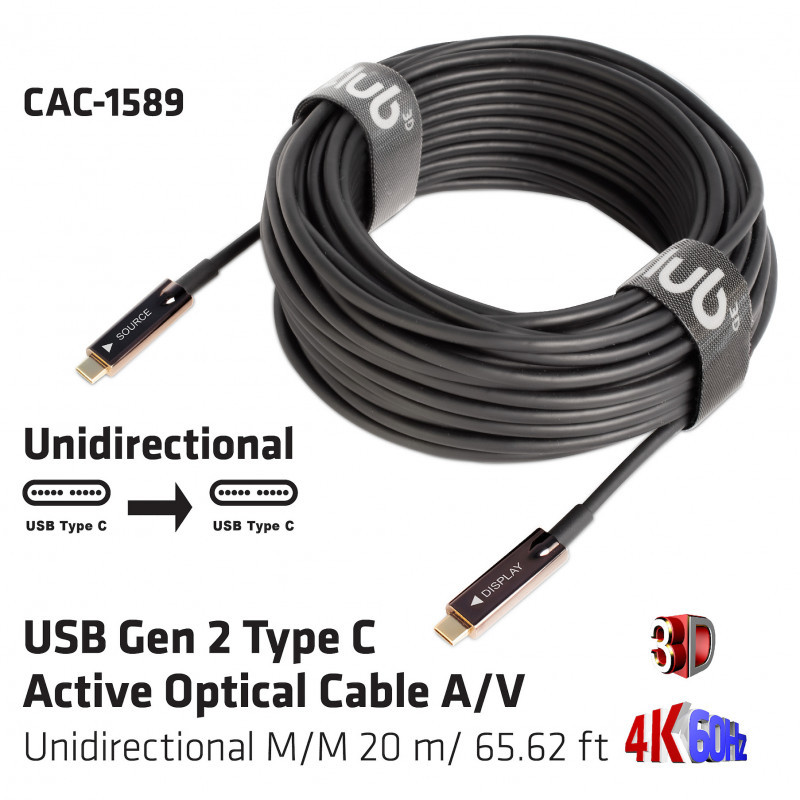 "CLUB3D USB Gen 2 Type C Active Optical Cable A/V Unidirectional M/M 20 m/ 65.62 ft. Cable length: 20 m. Connector 1: USB C, Connector 2: USB C, USB version: USB 3.2 Gen 2 (3.1 Gen 2), Product colour: Black"\n"The Club 3D CAC-1589 USB Gen 2 Type C AOC cable enables the connection of your Notebook, Tablet or Phone with USB Type C output to the latest USB C Peripherals and Accessories. It offers Video and Data over a single 20 m/ 65.62 ft cable.