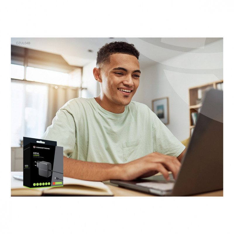 "Conceptronic OZUL05BE. Charger type: Indoor, Power source type: AC, Charger compatibility: Universal. Input voltage: 100 - 240 V, Maximum output voltage: 20 V. Power protection features: Overheating, Overload, Short circuit. Cable length: 1.8 m, Product colour: Black"\n"