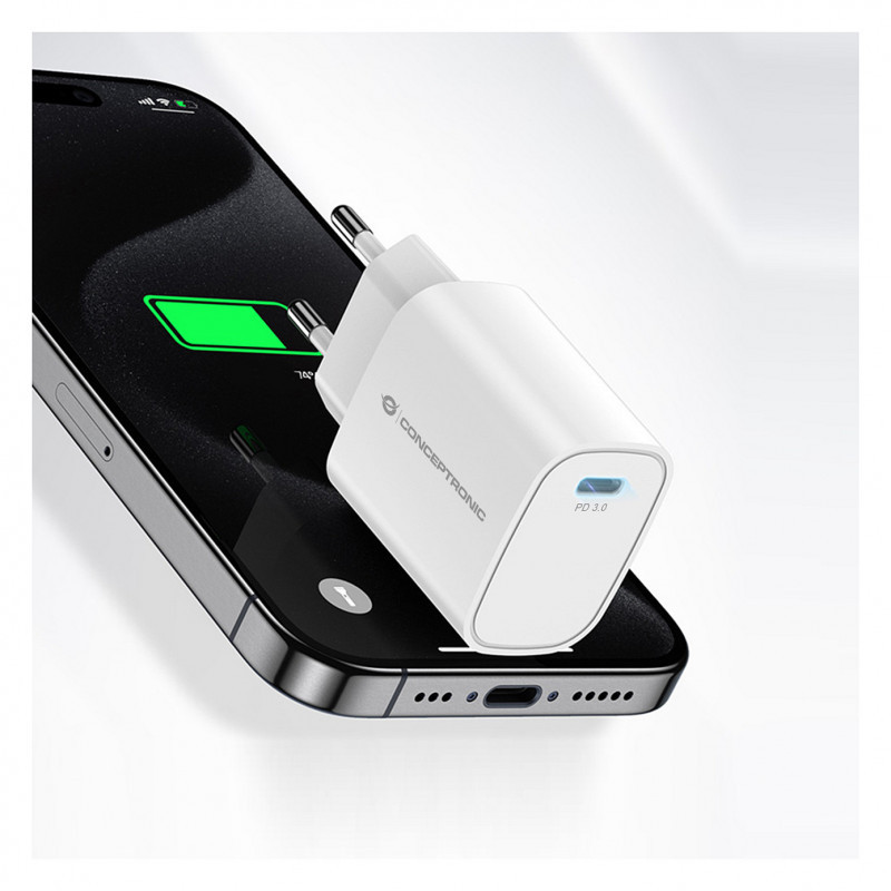 "Conceptronic 1-Port 20W USB-C PD Charger. Charger type: Indoor, Power source type: AC, Charger compatibility: Universal. Input voltage: 100 - 240 V, Maximum output voltage: 12 V. USB Type-C ports quantity: 1, Fast charging. Product colour: White"\n"