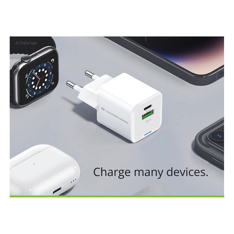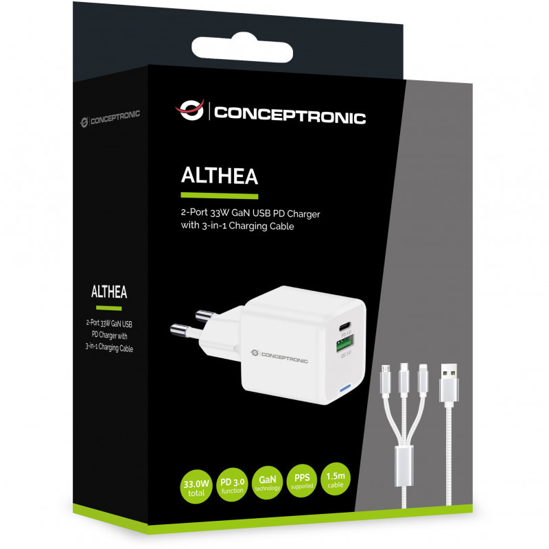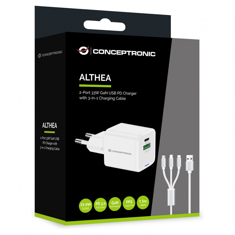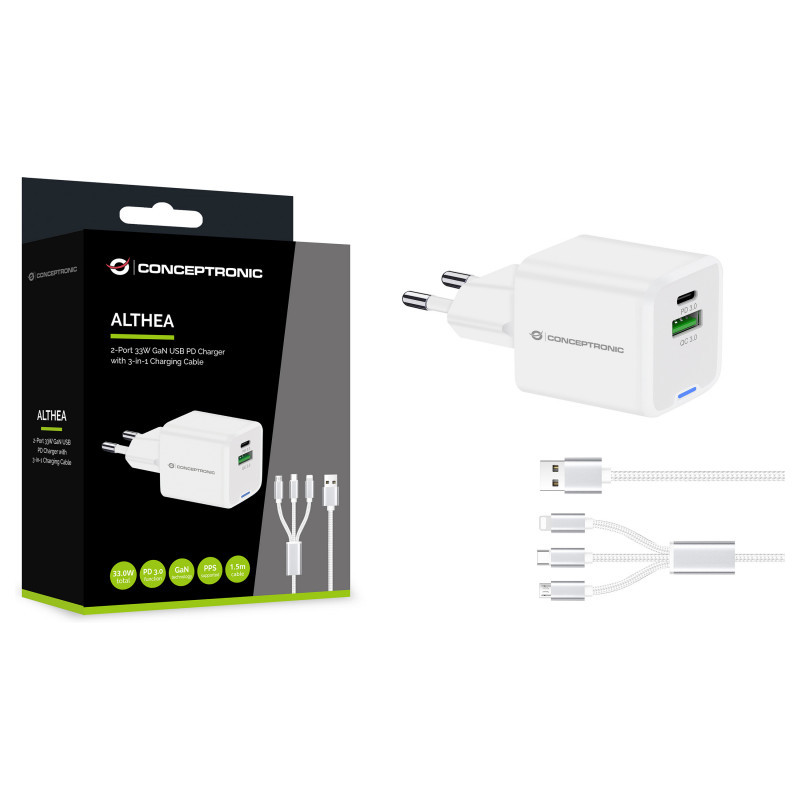 "Conceptronic 2-Port 33W GaN USB PD Charger with 3-in-1 Charging Cable, USB-C x 1, USB-A x 1, QC 3.0, PPS. Charger type: Indoor, Power source type: AC, Charger compatibility: Universal. Input voltage: 100 - 240 V, Maximum output voltage: 20 V. USB Type-C ports quantity: 1, Fast charging, Power protection features: Overheating, Overload, Short circuit. Cable length: 1.5 m, Product colour: White"\n"