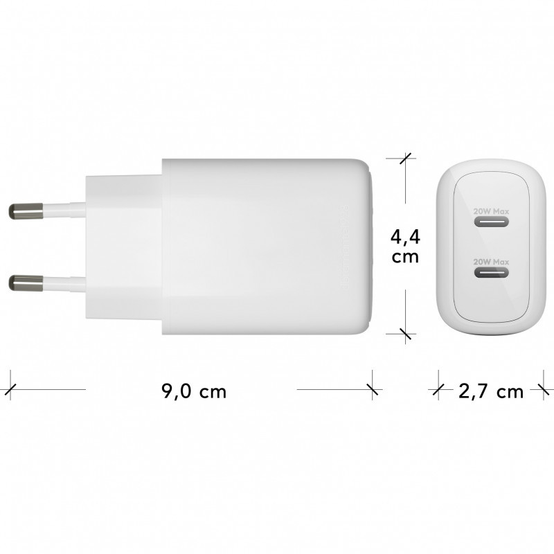 This compact 2x20-watt wall charger with USB-C Power Delivery means fast and safe charging for compatible USB-C-enabled devices. Purposefully designed to be travel-friendly, this pocket-sized charger easily fits to any environment at home or when you’re out and about."