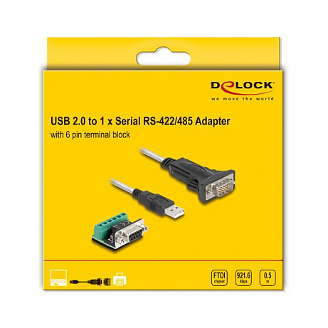 "DeLOCK Adapter USB 2.0 Type-A to 1 x Serial RS-422/485 male with 6 pin terminal block 5 V 0.5 m. Product colour: Black, Transparent, Cable length: 0.5 m, Connector 1: USB Type-A. Quantity per pack: 1 pc(s), Package type: Hanging box"\n"This USB 2.0 to serial adapter by Delock provides a standard RS-422 and RS-485 connection for measuring devices, POS systems, printers, modems, IoT devices etc.