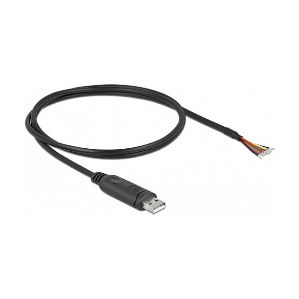 "DeLOCK Adapter cable USB 2.0 Type-A to Serial RS-232 with 9 open wires + Shielding 0.5 m. Product colour: Black, Cable length: 1 m, Connector 1: USB A. Quantity per pack: 1 pc(s)"\n"This USB 2.0 Type-A to serial RS-232 adapter cable by Delock is suitable as a connection cable between a device with USB 2.0 and a device with RS-232 port. With the tinned open cable ends, the connection can be made directly to the RS-232 device connector or flexible to various terminal blocks. In addition, it can be used to produce individual adapters and cable assemblies."