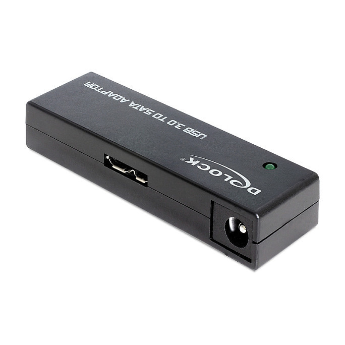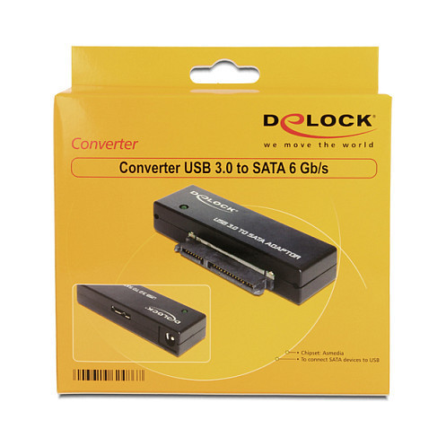 "DeLOCK 62486. Connector 1: USB3.0, Connector 2: SATA III. Product colour: Black"\n"This Delock converter can be connected to your PC or notebook via USB port and enables the connection of HDDs, SSDs and other drives with SATA 22 pin interface. The connected SATA devices use the full USB 3.0 speed, if they are SATA 6 Gb/s specified. The included power supply can be used for 3.5″ SATA HDDs or optical drives."