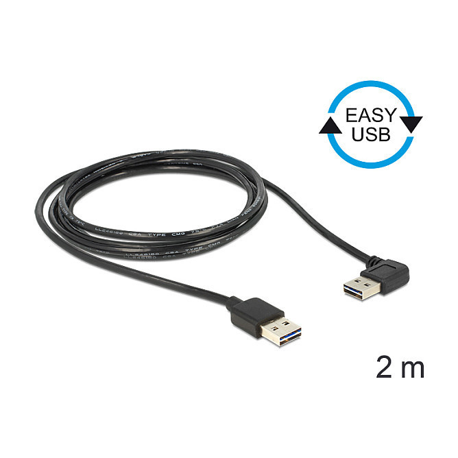 "DeLOCK 85557. Cable length: 2 m. Connector 1: USB A, Connector 2: USB A, USB version: USB 2.0, Maximum data transfer rate: 0.48 Gbit/s, Connector contacts plating: Gold, Product colour: Black"\n"This cable by Delock with EASY-USB male can be plugged into the USB-A female port in both directions. Thus the male port can be used both-sided and make the plug in easily."