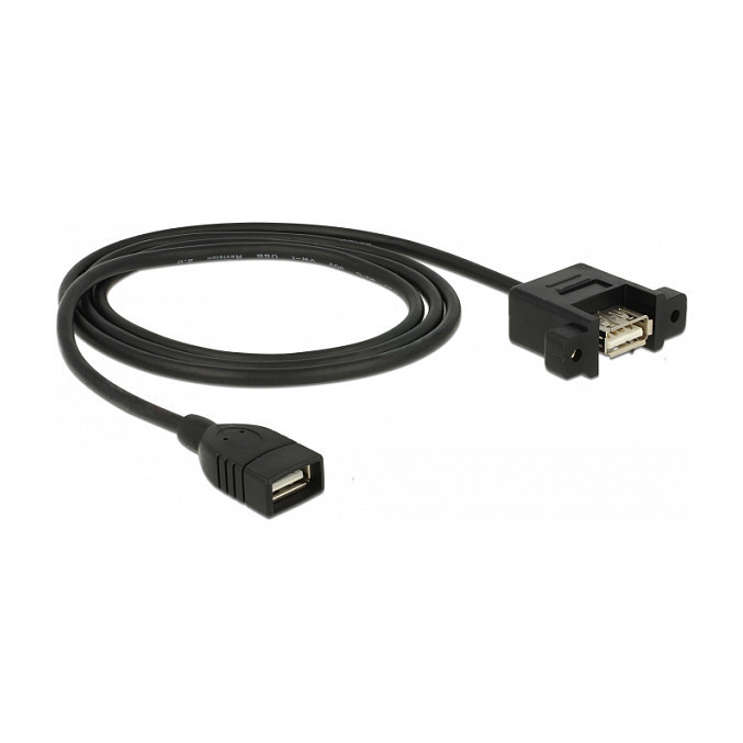 "DeLOCK 85460. Cable length: 1 m. Connector 1: USB A, Connector 2: USB A, USB version: USB 2.0, Maximum data transfer rate: 0.48 Gbit/s, Connector contacts plating: Gold, Product colour: Black"\n"This cable by Delock can be used to extend an USB connection and to connect various devices. The female port can be attached with two screws, e.g. to a slot bracket, a cable duct or an enclosure with the corresponding opening. In this way, it is possible to install a USB connector in an easily accessible position."