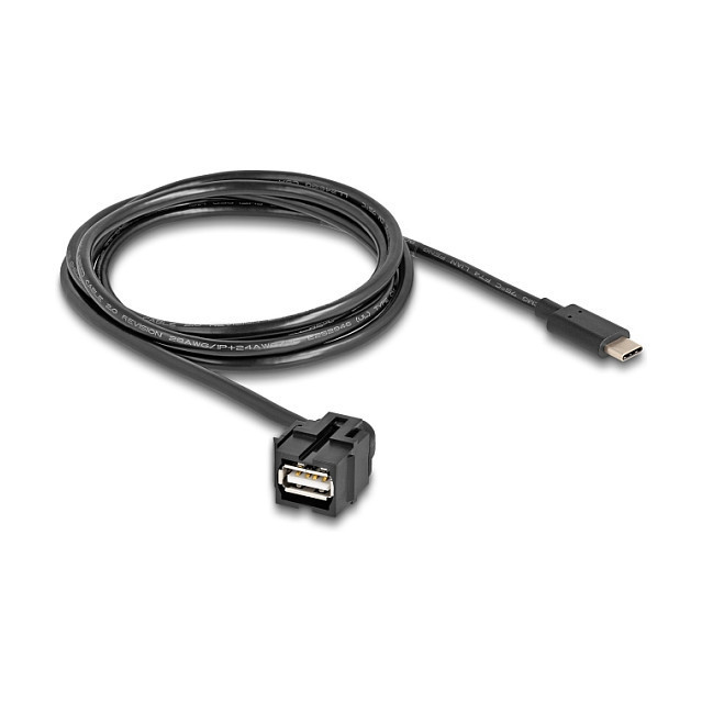 "DeLOCK Keystone Module USB 2.0 A female to USB Type-C male 250° with cable 1.5 m. Cable length: 1.5 m. Connector 1: USB A, Connector 2: USB C, USB version: USB 2.0, Product colour: Black"\n"This module by Delock can be used to extend e.g. a USB cable. With its standardised dimensions it can be used for easy snap-in mounting in e.g. a Keystone patch panel, face plate or surface-mount box. The short, angled cable has a small mounting depth and allows a space-saving installation in hard to reach places in equipment or in cable ducts."