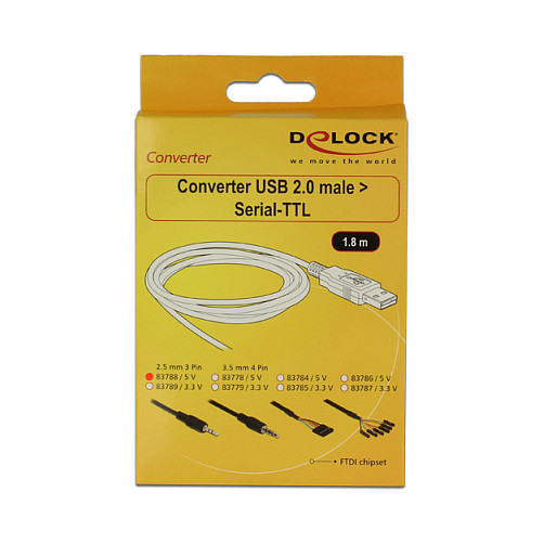 "DeLOCK 1.8m USB 2.0-A/2.5mm. Connector 1: 2.5mm, Connector 1 gender: Male, Connector 2: USB Type-A, Connector 2 gender: Male, Cable length: 1.8 m, Product colour: Black"\n"This USB TTL converter by Delock is due to its wide temperature range most suitable for industrial applications. It can be used for e.g. level converter, GPS-modules, interface controller, micro controller etc."