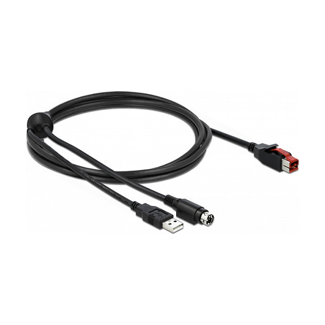 "DeLOCK PoweredUSB cable male 24 V to USB Type-A male + Mini-DIN 3 pin male 2 m for POS printers and terminals. Product colour: Black, Connector 1: PoweredUSB, Connector 2: USB A/Hosiden Mini-DIN 3 pin. Quantity per pack: 1 pc(s). Country of origin: China"\n"This PoweredUSB cable by Delock can be used to connect a device with USB Type-A port and Hosiden Mini-DIN 3 pin power port to a PC or hub with PoweredUSB 24 V port. It is suitable for connecting various POS devices such as printers and terminals, e.g. by Bixolon or other manufacturers. The cable is used both for data transmission and for power supply of the connected device."