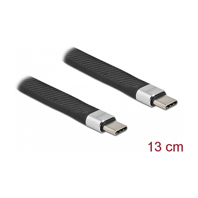 "DeLOCK USB 2.0 FPC Flat Ribbon Cable USB Type-C to USB Type-C 13 cm PD 5 A E-Marker. Cable length: 0.13 m. Connector 1: USB C, Connector 2: USB C, USB version: USB 2.0, Maximum data transfer rate: 0.48 Gbit/s, Product colour: Black"\n"This USB cable by Delock enables the connection between a device with a USB Type-C™ connector and a PC or a laptop equipped with a free USB Type-C™ port.