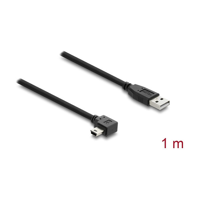 "DeLOCK USB 2.0 Cable Type-A male to Type Mini-B male right angled 1 m. Cable length: 1 m. Connector 1: USB A, Connector 2: Mini-USB B, USB version: USB 2.0, Maximum data transfer rate: 0.48 Gbit/s, Connector contacts plating: Gold, Product colour: Black"\n"This USB cable by Delock enables the connection between a device with a USB Mini-B connector and a PC or a laptop equipped with a free USB Type-A port."