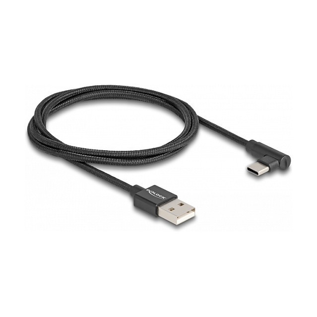 "DeLOCK USB 2.0 Cable Type-A male to USB Type-C male angled 1 m black. Cable length: 1 m. Connector 1: USB A, Connector 2: USB C, USB version: USB 2.0, Maximum data transfer rate: 0.48 Gbit/s, Product colour: Black"\n"This USB cable by Delock enables the connection between a device with a USB Type-C™ connector and a PC or a laptop equipped with a free USB port. Optically it convinces with its fine textile shielding and with its connector in metal housing.
