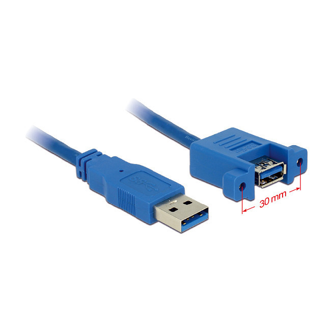 "DeLOCK USB 3.0 A, 1m. Cable length: 1 m. Connector 1: USB A, Connector 2: USB A, USB version: USB 3.2 Gen 1 (3.1 Gen 1), Connector gender: Male/Female, Maximum data transfer rate: 5 Gbit/s, Product colour: Blue"\n"This cable enables you to extend a USB 3.0 connection and can be used to connect various devices. The female port can be attached with two screws, e.g. to a slot bracket, a cable duct or an enclosure with the corresponding opening. This can be used to install an USB connector on an easily accessible position."