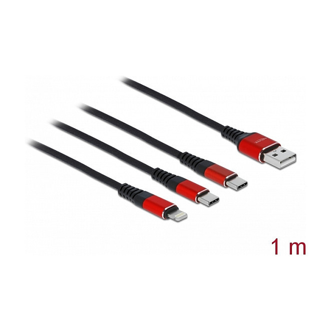 "DeLOCK USB Charging Cable 3 in 1 Type-A to Lightning / 2 x USB Type-C 1 m black / red. Cable length: 1 m. Connector 1: USB A, Connector 2: USB C/Lightning, USB version: USB 2.0, Connector contacts plating: Copper, Product colour: Black, Red"\n"This 3 in 1 charging cable by Delock can be used for charging of different devices e.g. tablets or smartphones with Lightning™ or USB Type-C™ interface through a USB power source.