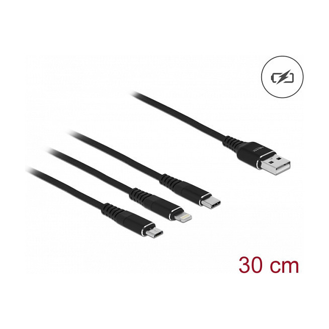 "DeLOCK USB Charging Cable 3 in 1 Type-A to Lightning / Micro USB / USB Type-C 30 cm black. Cable length: 0.3 m. Connector 1: USB A, Connector 2: USB C/Micro-USB B/Lightning, USB version: USB 2.0, Product colour: Black"\n"This 3 in 1 charging cable by Delock can be used for charging of different devices e.g. tablets or smartphones with Lightning™, Micro USB-B or USB Type-C™ interface through a USB power source.