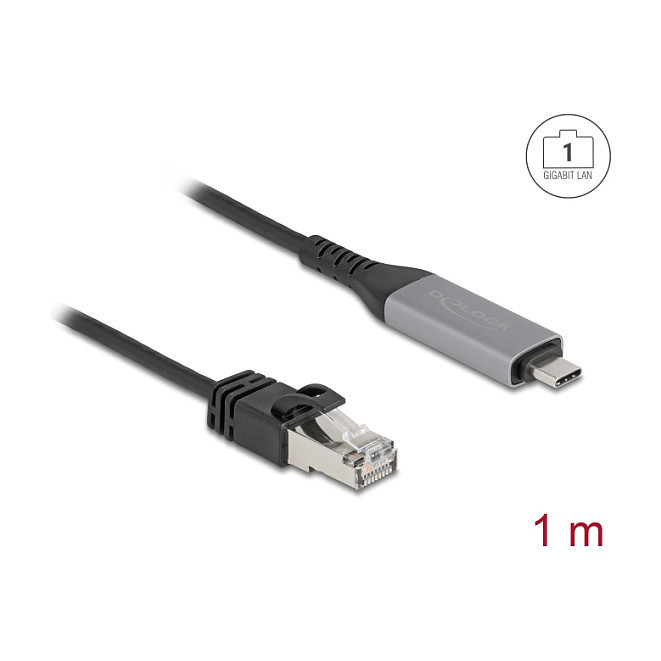 "DeLOCK USB LAN Cable USB Type-C to RJ45 Gigabit Ethernet 1 m. Cable length: 1 m, Cable standard: Cat6, Connector 1: USB Type-C, Connector 2: RJ-45, Data transfer rate: 1000 Mbit/s, Product colour: Black, Anthracite"\n"This USB to LAN cable by Delock enables a stable, wired network connection to a PC or Laptop with USB Type-C™ port.