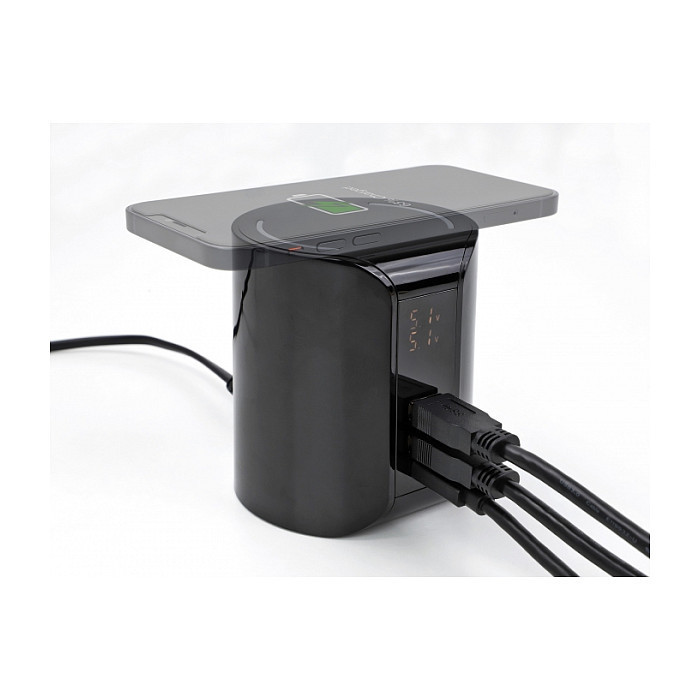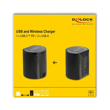 "DeLOCK USB and Wireless Charger 1 x USB Type-C PD + 2 x USB Type-A with 58 W. Charger type: Indoor, Power source type: AC, Charger compatibility: Smartphone. Input voltage: 100 - 240 V. USB 2.0 ports quantity: 1, USB Type-C ports quantity: 1, Wireless charging, Fast charging, Power protection features: Short circuit. Cable length: 1.2 m, Product colour: Black"\n"This USB Power Delivery (PD) charger by Delock can be used to charge smartphones and tablets. It provides various voltages from 5 V to 12 V on the USB Type-C™ port and power up to 58 watt. In addition, one USB Type-A port with fast charging technology and one USB Type-A port with 2.4 A are available.